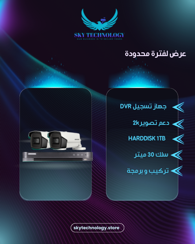 نقدم لكم عرض SKY TECHNOLOGY المحدود لضمان أقصى درجات الأمان لمنزلك أو عملك. تتضمن هذه الباقة الأمنية المتكاملة جهاز تسجيل DVR عالي الأداء يدعم تقنية التصوير فائق الوضوح بدقة 2K (مع كاميرات Hikvision احترافية بدقة 2 ميجابكسل). لضمان حفظ لقطات المراقبة لفترة طويلة، يأتي الجهاز مزوداً بقرص صلب (HARDDISK) بسعة 1 تيرابايت. كما يشمل العرض جميع المستلزمات الضرورية، بما في ذلك سلك بطول 30 مترًا لتوصيل الكاميرات، بالإضافة إلى خدمة التركيب والبرمجة الاحترافية لضمان جاهزية النظام للعمل فورًا. احصل على هذا الحل الأمني الشامل الآن لفترة محدودة!